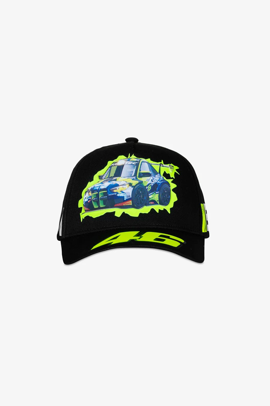 Children's cap belonging to the VR46 WRT collection. Made of cotton, it features an embossed TPU print on the front, depicting the illustration of the BMW M4 GT3 driven by Valentino Rossi, created by artist Andrew Ritter. The number 46 is printed on the visor, and along the circumference the claim "WE ARE A TEAM". A patch with the WRT logo is applied to the back. One size adjustable.